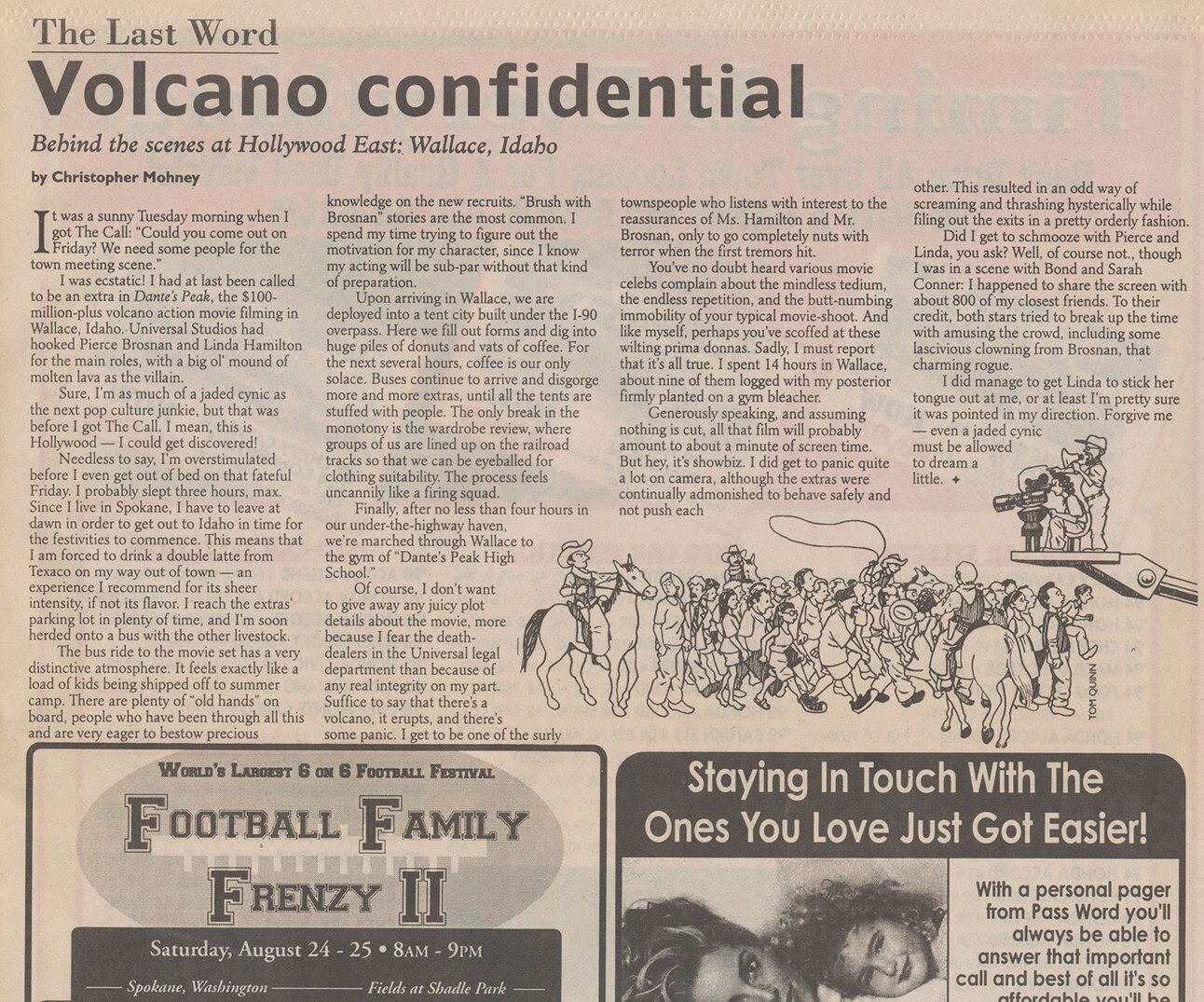 My first published freelance writing predates the digital era by a few years. I’d had a handful of disposable poems and short stories published here and there, and a couple articles printed at other places where I interned. But it was in 1996 that I first got paid for writing a freelance article. This was a story about my experience as an extra for the Pierce Brosnan volcano movie Dante’s Peak, published in the Pacific Northwest Inlander in Spokane, Washington, where I was going to grad school. I think I got paid fifty bucks, or maybe even a hundred. But at least fifty.
