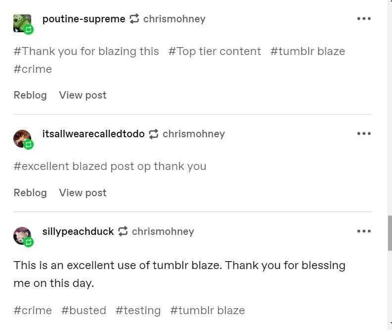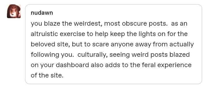 On 4/20 of this year, Tumblr announced a new feature: Tumblr Blaze, the platform’s version of paying to quick-promote a single post. Initial announcements about Blaze exhibited a magisterial understanding of Tumblr’s core power audience by actively encouraging using the tool for frivolous amusement—even outright shitposting—rather than couching the pitch in the anodyne terms of paid engagement and ROI blah blah blah.