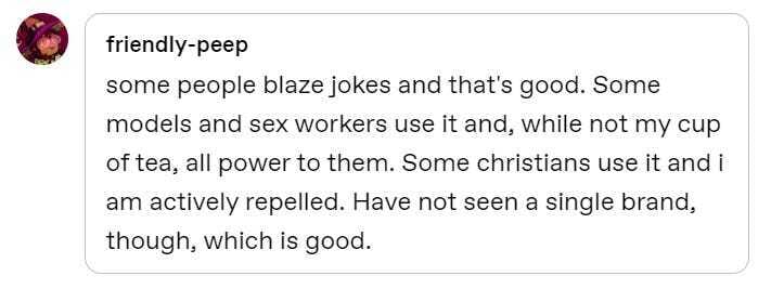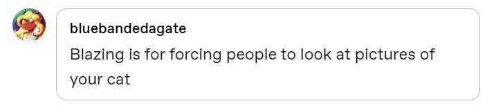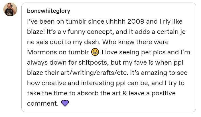 More interesting were the responses I had asked for. In general, Tumblr users were positive about Blaze, applauding its frivolous and chaotic nature, with the occasional caveat.
