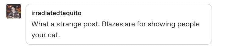 But in the spirit in which Blaze is apparently intended, I decided to test the most common response: that Blaze is best for posting your cat. So I posted a video of my cat Oliver unrolling toilet paper, and Blazed it for $25. Classic!