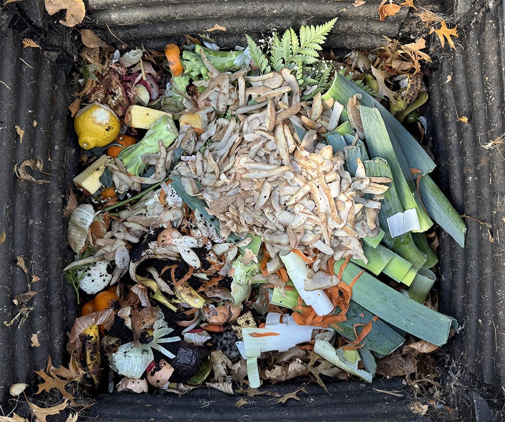 This week: a post-Thanksgiving compost bounty of potato and sweet potato peels, leeks, lemon, apple cores, garlic, onion, peppers, roses, carrots, avocado, coffee grounds, eggshells, grapes, broccoli stems, and probably other stuff I forgot. I wasn’t the only one cooking!