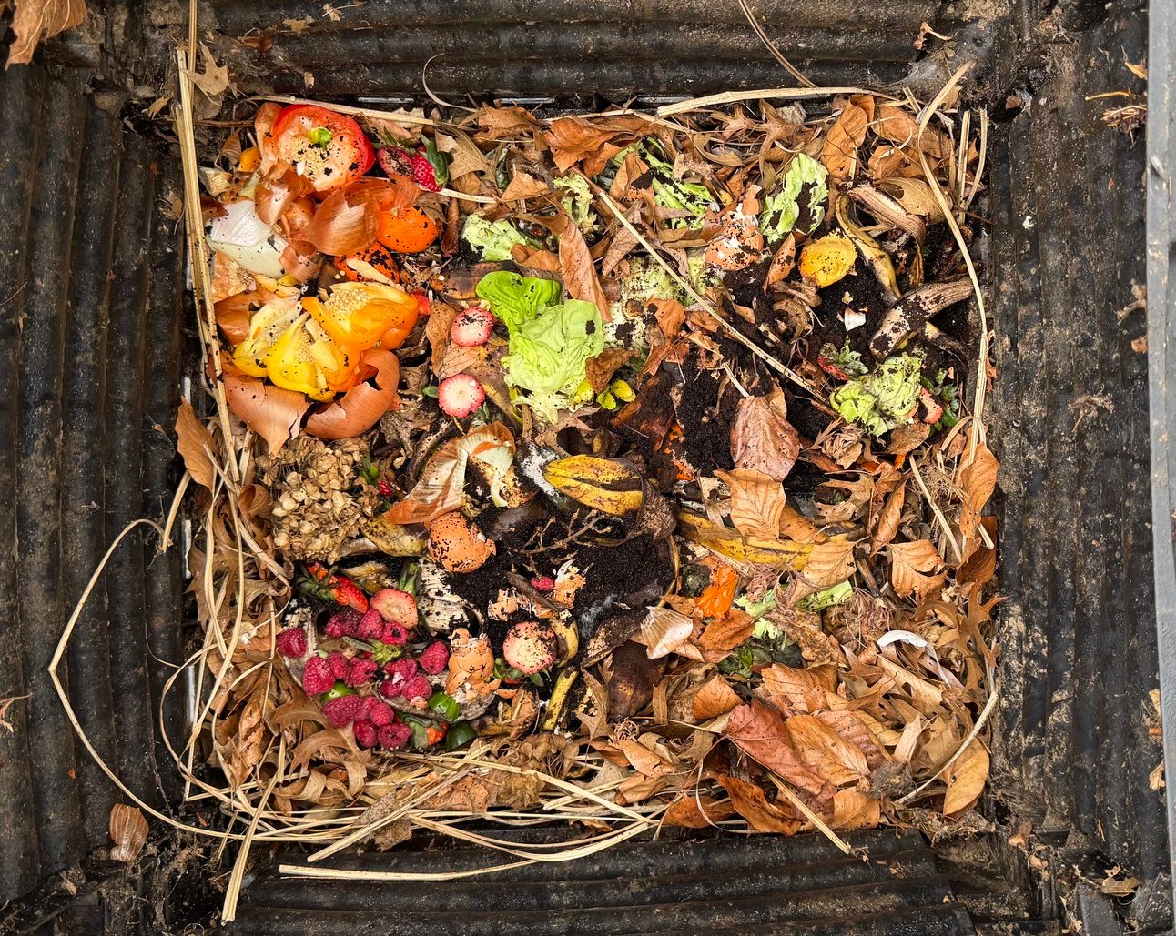 This week: bell peppers, strawberry tops, butter lettuce hearts, eggshells, onion bits, banana peels coffee grounds, broccoli stems, raspberries.