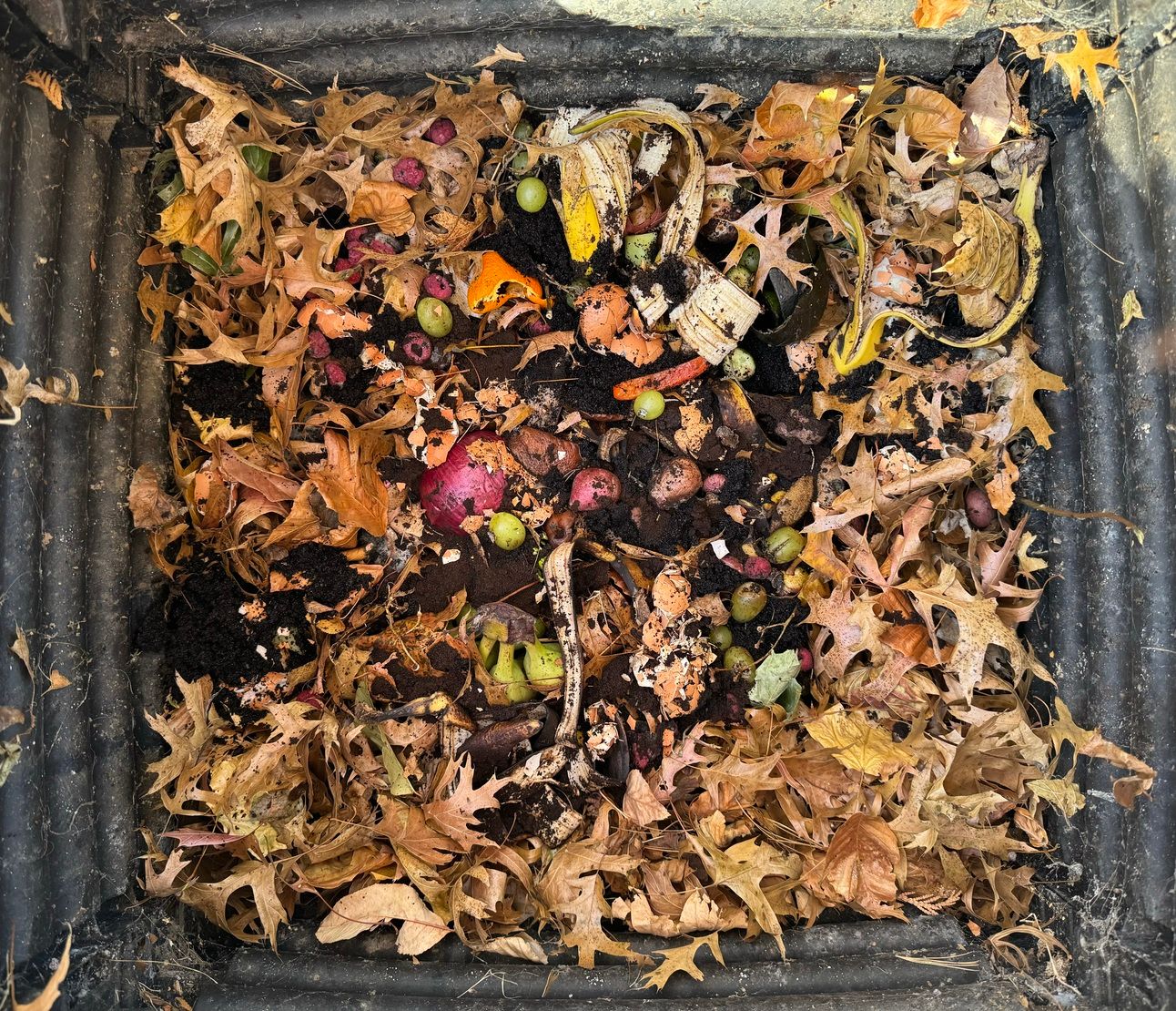 Some things persevere, even after a year of composting. Fruit pits are common to find in compost, especially avocado pits and peach pits, though they do attract colonies of little worms eventually. Sometimes avocado shells can even survive, though they become brittle and crumble easily. Little wads of eggshell reliably turn up here and there, taking a couple years of weathering to give up their precious calcium.
