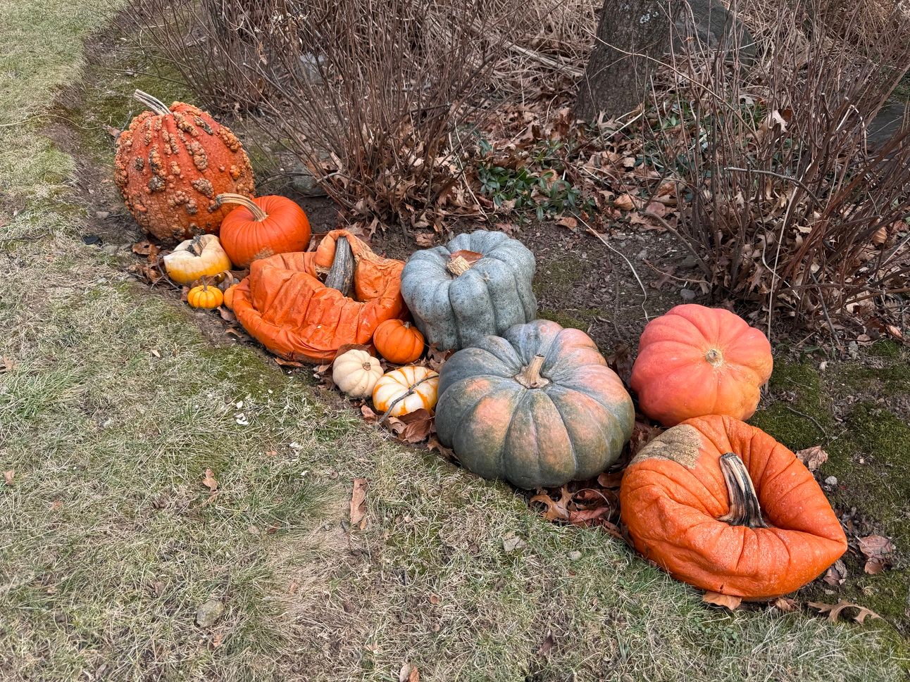 We picked up some pumpkins for autumnal vibes in October, and as is tradition I moved them to the backyard in early December once they started to look decrepit, as I wasn’t interested in cleaning pumpkin goo off the front steps (again). This crop surprised me by not changing much over several weeks even after the move, until right at the new year when the largest rapidly deflated.